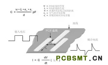圖5 在PCB上布兩條靠近的走線,很容易形成寄生電容。由于這種電容的存在,在一條走線上的快速電壓變化,可在另一條走線上產(chǎn)生電流信號(hào)