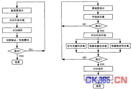 如圖1是傳統的設計方法,在后測試之前,沒有做任何的處理,基本都是依靠設計者的經驗來完成的.在對樣機測試檢驗時才可以查找到問題,確定問題原因.為了解決問題,很可能又要從頭開始設計一遍.無論是從開發周期還是開發成本上看,這種主要依賴設計者經驗的方法不能滿足現代產品開發的要求,更不能適應現代高速電路高復雜性的設計.所以必須借助先進的設計工具來定性、定量的分析,控制設計流程.