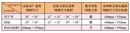 全球范圍內(nèi),絲網(wǎng)印刷機品牌和型號較多,其中主流品牌主要有“MPM”、“DEK”、“PANASERT”等,所有這些品牌的印刷機都需使用到絲網(wǎng)板(鋼模板)Stencil,以上三種主流品牌印刷機對Stencil尺寸要求如下表: