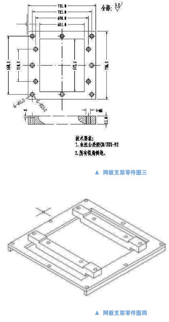 為保證網(wǎng)板支架和鋼模板安裝定位,使用連接固定螺釘(Screw),保證其安裝連接的穩(wěn)定和通用性,對安裝連接螺釘、網(wǎng)板支架連接孔、網(wǎng)板連接孔的尺寸要求比較特殊。經(jīng)過分析和實際使用,可以采用M4的公制螺釘和螺紋孔;或者采用5/32的美制螺釘和螺紋孔,以上兩種尺寸和公英制基本上可以通用。