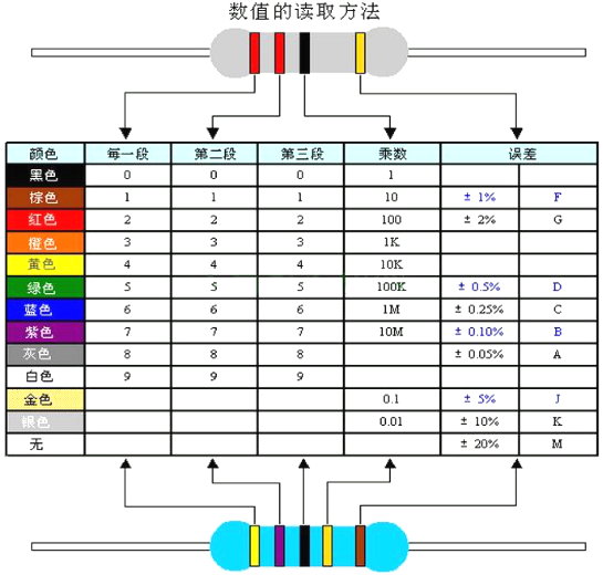 2、色環標注法使用多,一道色環表示阻值的大一位數字,二道色環表示二位數字,三道色環表示阻值未應該有幾個零,四道色環表示阻值的誤差。